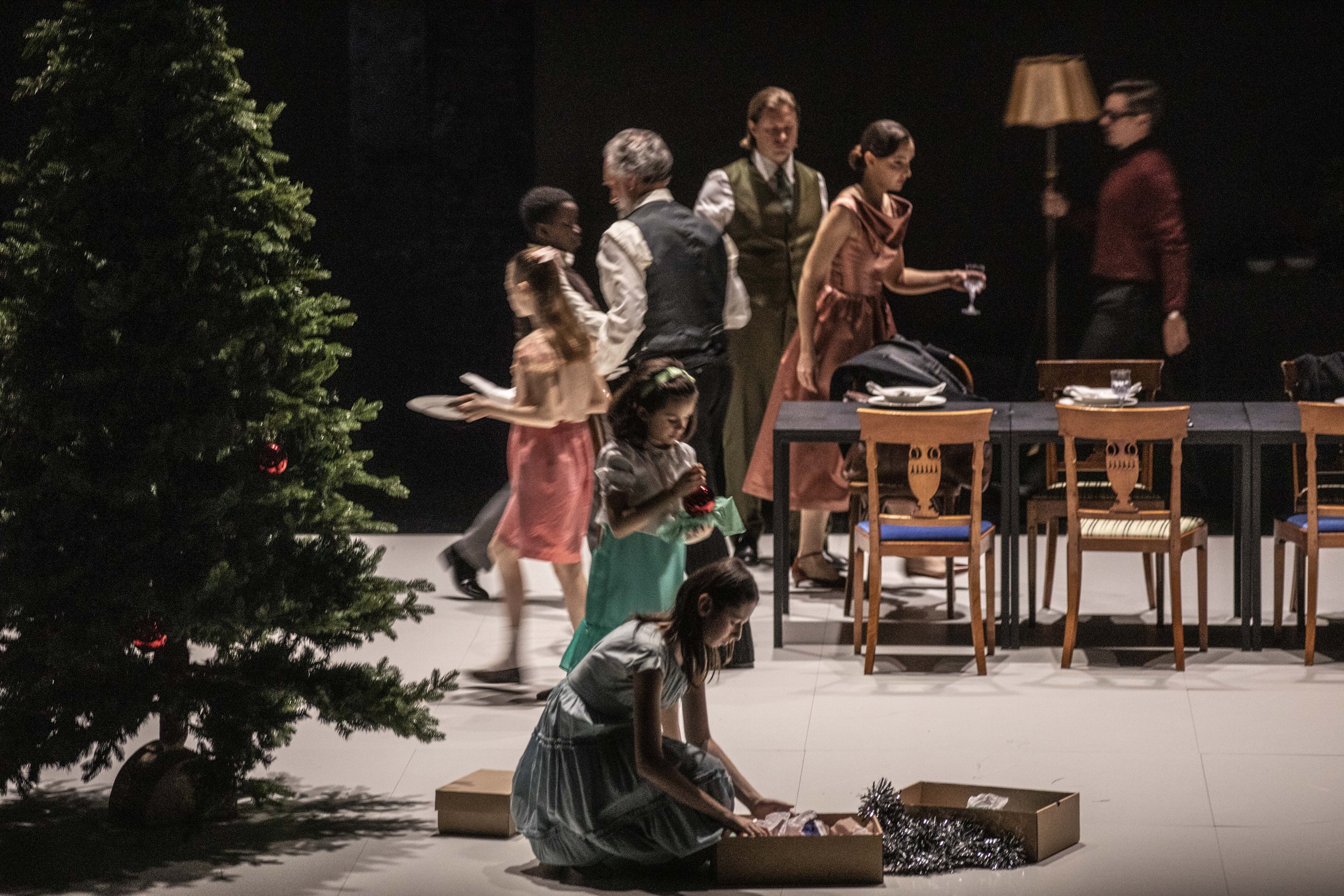 Ainsi, dans cette mise en scène de Ted Huffman qui, de prime abord, paraît bien trop simple -le plateau nu, une salle avec quelques chaises, une table que l’on dresse pour un repas réunissant famille et amis, et plus tard un arbre de Noël que la jeune Sophie s’obstine à décorer)-, c’est le contraste entre cette tranquillité d’un foyer, celui du bailli (même si, parfois, s’ombre de tristesse aussi ce personnage où la mère décédée, laissant de jeunes enfants, fait sentir son absence), et le visiteur terrassé par la solitude, avant même de l’être par l’amour, qui nous saute au regard. Werther-Pati, dans son grand manteau, est toujours en retrait, toujours, sur le plateau, là où les autres ne sont pas. Et parfois caché, immobile, presque absent à lui-même, alors que tous les autres s’agitent à des tâches quotidiennes, triviales même, mettre le couvert, apprendre un chant, remplir d’eau une carafe, servir la soupe, traîner un sapin.
